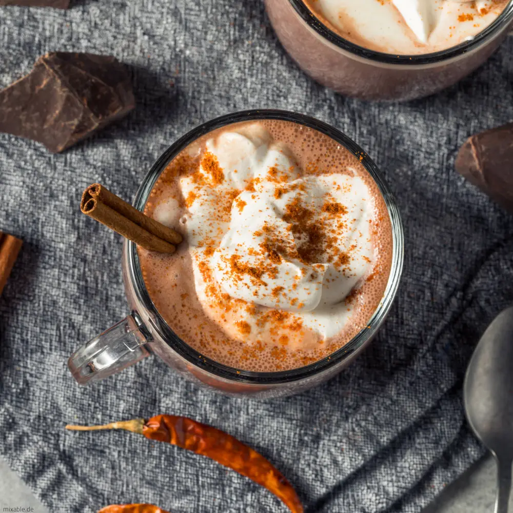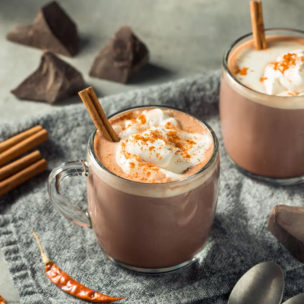- Put the milk, sugar, cocoa powder, cinnamon, vanilla extract, chili powder, cayenne pepper and salt in a pot and heat. The milk should be warm, but not boiling!