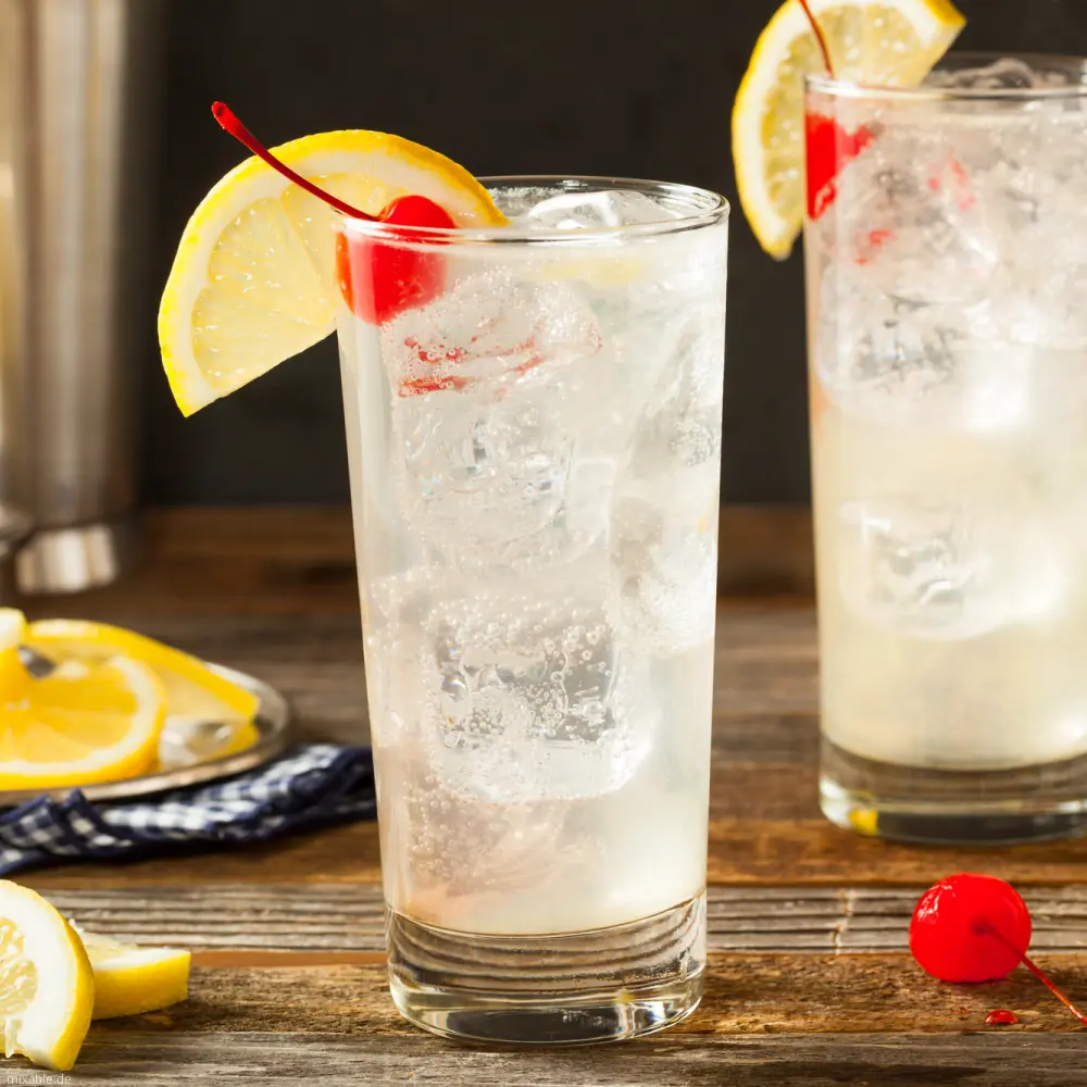 The Tom Collins is similar to the Gin Fizz, but when preparing the Tom Collins, the ingredients are preferably stirred in the glass.